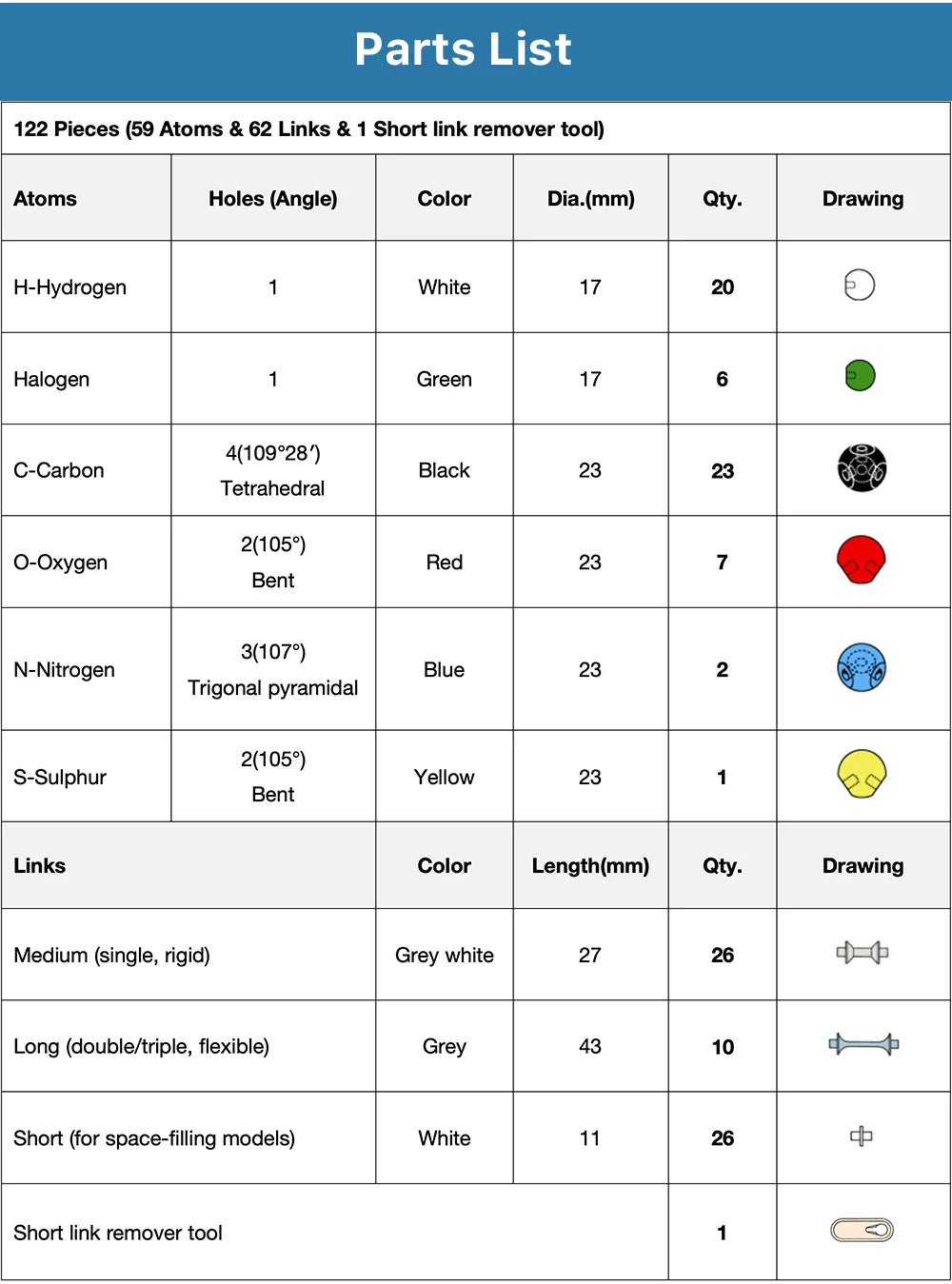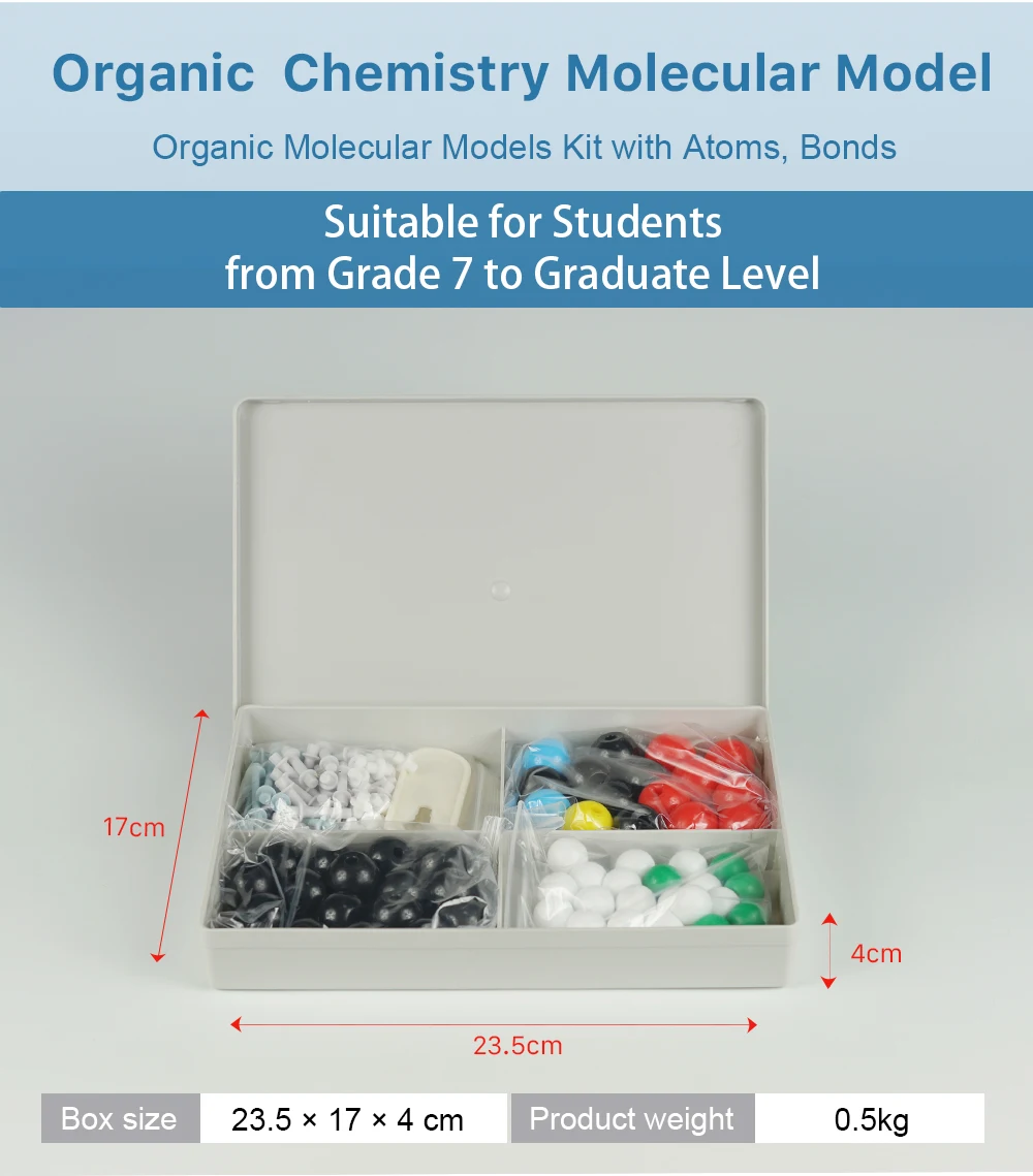 The 122 PCS (59 Atoms & 62 Links & 1 Short link remover tool) Molecular Models Set is designed for school teaching. It allows you to visualize the bonds between atoms in three dimensions. The elements are represented by colored balls and the bonds by flexible rods.